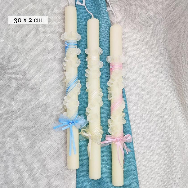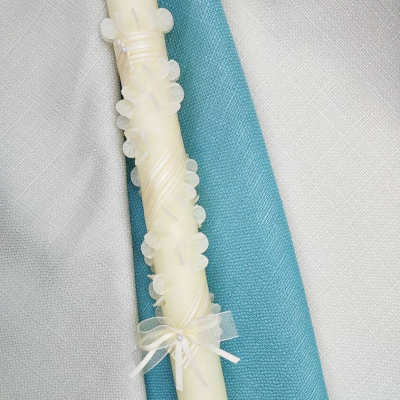 Vela de bautizo decorada con una cinta, y flores pinzadas en espiral, con un lazo y una perla blanca.