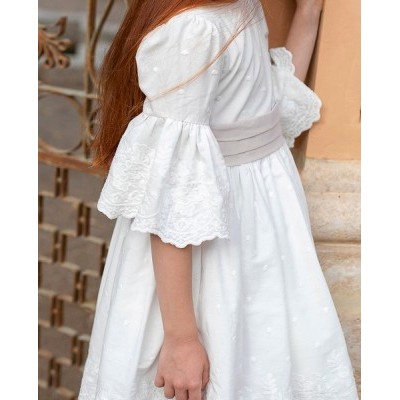 Clásico faldón para bautizo corto, confeccionado en tul de plumeti de color blanco con diferentes bordados decorativos, esta fabricado artesanalmente en España, se puede confeccionar con manga larga, manga corta rizada o manga sisa, además de poder añadir braguita y capota de manera opcional. Disponible por encargo durante todo el año.