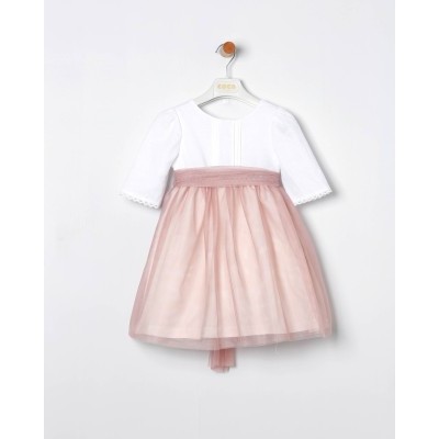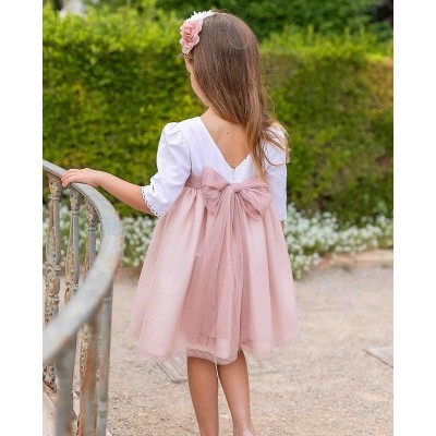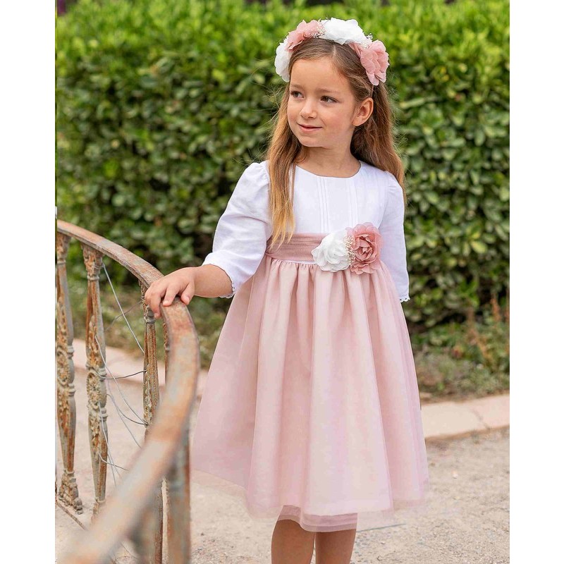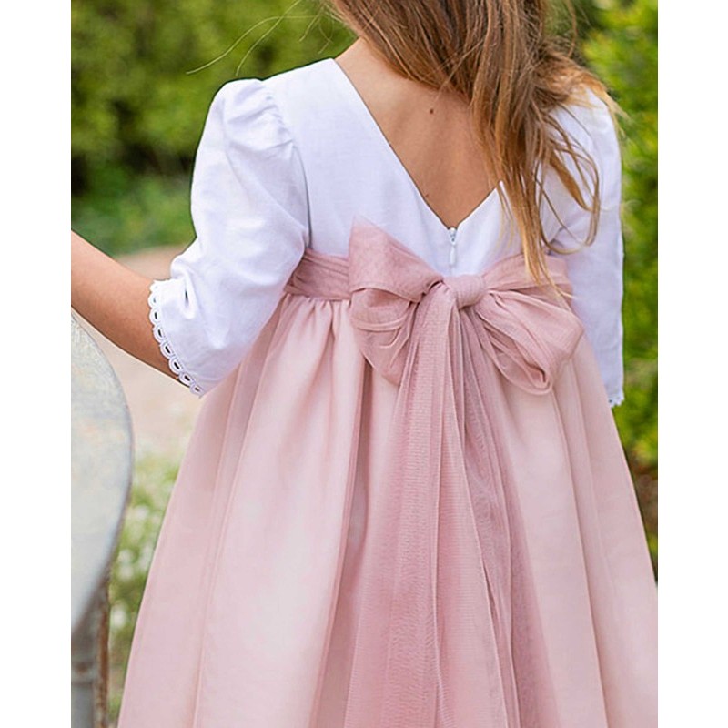 capa para niña de arras y ceremonia, confeccionada en lino de muy alta calidad de color rosa empolvado, interior forrado para mayor comodidad, rematada en pequeñas tablas y lazada en cuello. FABRICADA DE ESPAÑA.