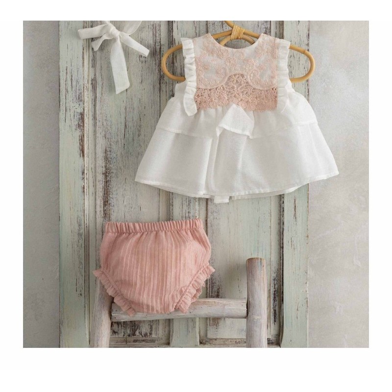 Clásico jesusito para bautizo con braguita, confeccionado en organza rayada crudo, con lazo decorativo en el pecho, esta fabricado artesanalmente en España, se puede confeccionar con manga larga, manga corta rizada o manga sisa, además de poder añadir capota de manera opcional. Disponible por encargo durante todo el año.