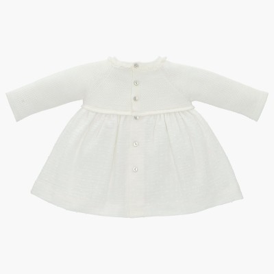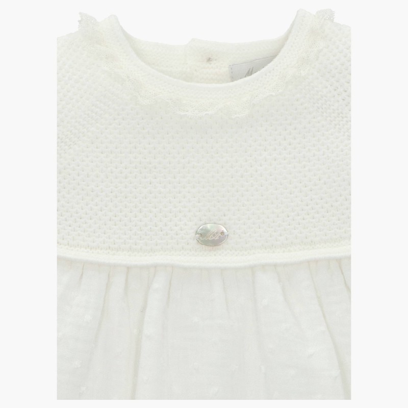 Clásico faldón para bautizo corto, confeccionado en tul de plumeti de color blanco con diferentes bordados decorativos, esta fabricado artesanalmente en España, se puede confeccionar con manga larga, manga corta rizada o manga sisa, además de poder añadir braguita y capota de manera opcional. Disponible por encargo durante todo el año.
