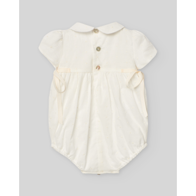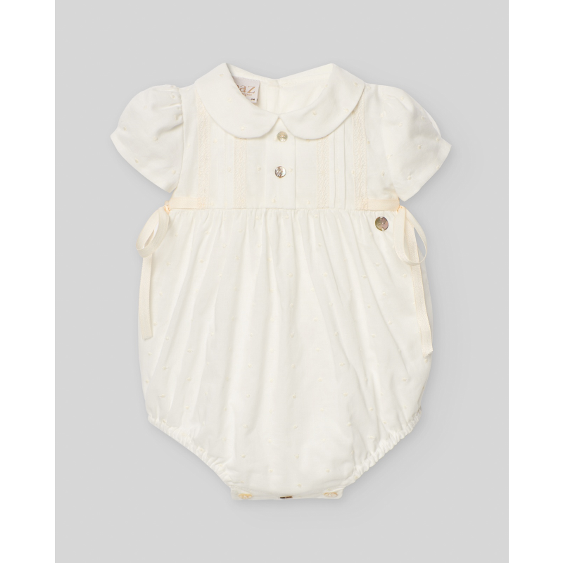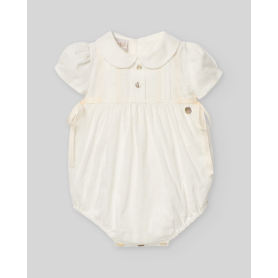 Clásico Pelele para bautizo, confeccionado en tul bordado de color beige, tiene varios bordado y puntillas, esta fabricado artesanalmente en España, se puede confeccionar con manga larga, manga corta rizada o manga sisa, además de poder añadir capota de manera opcional. Disponible por encargo durante todo el año.