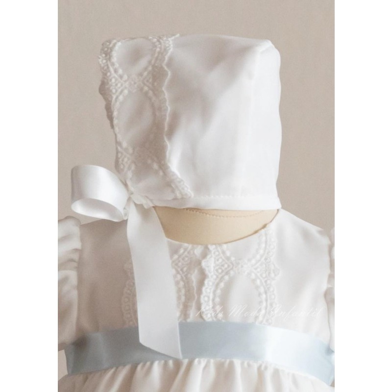 Clásico faldón para bautizo corto, confeccionado en tul de plumeti de color blanco con diferentes bordados decorativos, esta fabricado artesanalmente en España, se puede confeccionar con manga larga, manga corta rizada o manga sisa, además de poder añadir braguita y capota de manera opcional. Disponible por encargo durante todo el año.